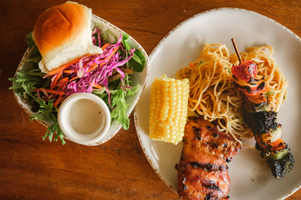 ISLAND BBQ: Captain Coon’s kiawe pulehu (grilled) BBQ *Chicken, Asian Stir-Fried Noodles, *Seasonal Vegetable, *Tossed Green Salad with Mom’s Secret Dressing, and Assorted dinner rolls. A wide assortment of non-alcoholic beverages are available throughout the day.